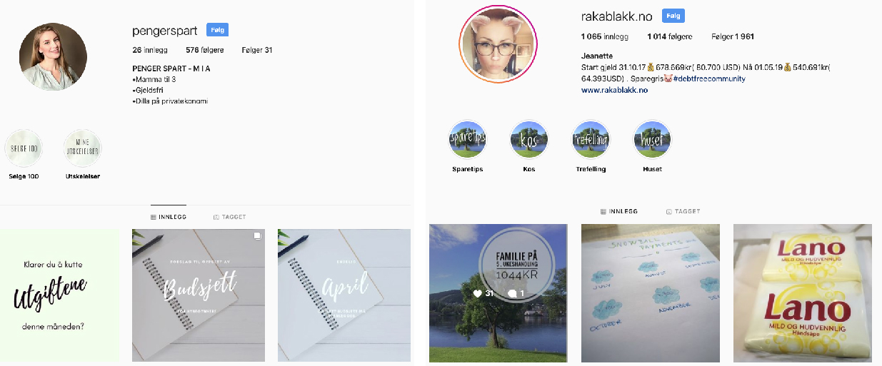 Og der er flere: Rakablakk, Pengerspart, Spareglede, Rikereliv, Lev__mer, Voksentilslutt, Borsdamer, Gjeldsfri, Kristinsamskott, og Enklere økonomi er eksempler på norske Instagram-profiler med fokus på lavere forbruk, bærekraftige valg, gode investeringer og å spare penger. Felles for dem er at de bruker økonomi som inspirasjon til å nå større mål, og de fremmer en ny forståelse av personlig økonomi og familieøkonomi.