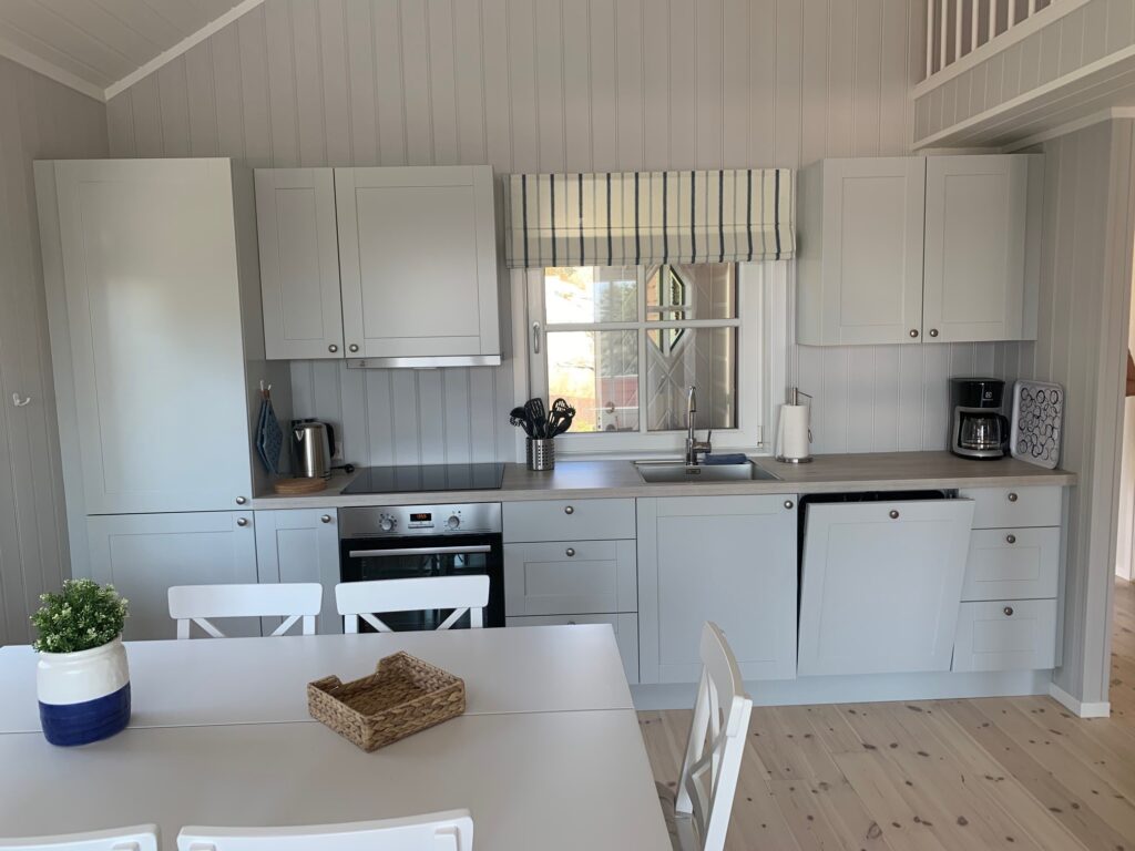 Hyttene har stue og kjøkken i ett. Kjøkkenet er utstyrt med stort kombiskap med god frysekapasitet. Videre er det keramisk platetopp og stekeovn samt oppvaskmaskin.