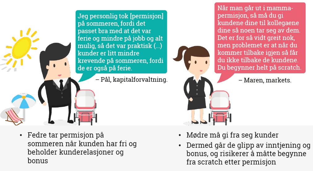 - Kvinner og menn konkurrerer ikke på like vilkår: Det er menn med bakkemannskap på hjemmebane, som kan være kontinuerlig tilgjengelige på kundenes premisser–også under foreldrepermisjon –som vinner konkurransen om de beste kundene, de beste dealene, og de beste lønningene.