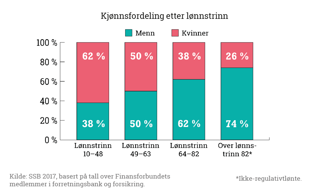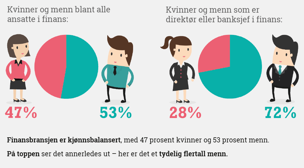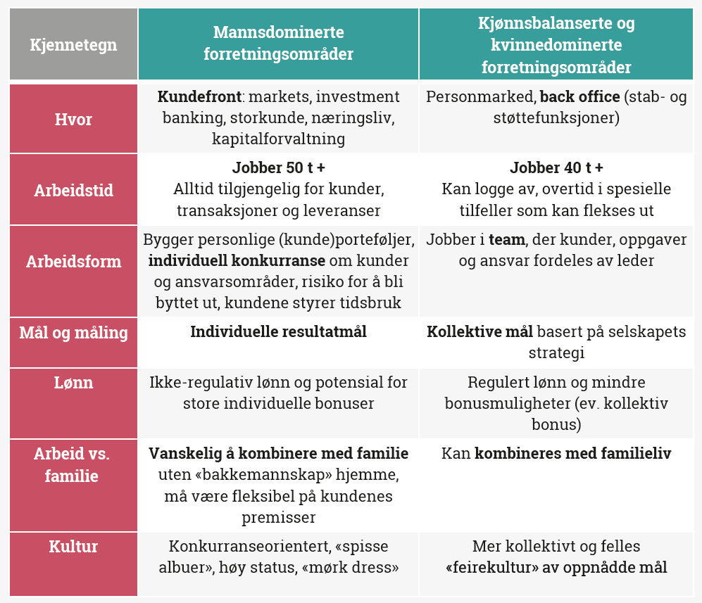 - Menn jobber oftere i kundefront i markets, investmentbanking, kapitalforvaltning og med store næringslivskunder som gir større lønns-og bonusmulighet.